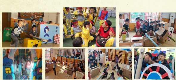 (3)“海洋游戏馆”的诞生。 虽然孩子们的游戏动静不同,但合作却非常默契。有的时候,战争开始了,遇到突发情况,孩子们就会把“美人鱼宫殿”变成“海战”的“弹药生产基地”或“科研研发基地”;而战争结束,其他的孩子又会加强入到“海底探秘”或“花车游行”中一起游戏、庆祝。 很多我们成人看起来非常违和的镜头,他们却能非常巧妙地融合。这里不但有各个国家的战争,更有和外星球、外太空的对抗,孩子们将“海洋码头”更名为“海洋游戏馆” 。