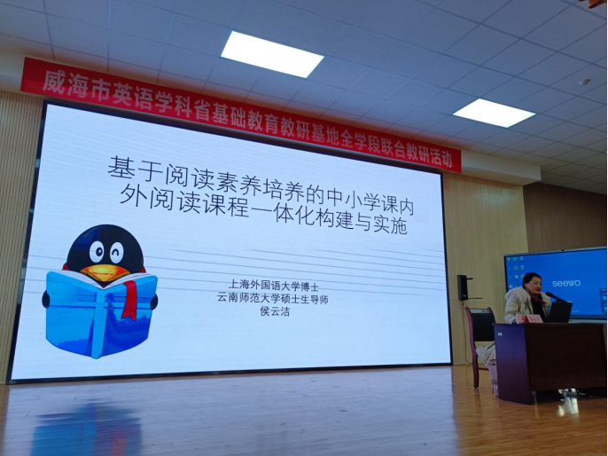 为切实推进威海市英语学科省基础教育教研基地建设,打破小学、初中、高中学段壁垒,深入开展英语全学段贯通式教研,威海市英语学科省基础教育教研基地全学段联合教研活动于2023年3月16日至17日在威海市经区九龙湾小学举行,聚焦基地建设和发展的路径探索、英语阅读课程一体化构建与实施等基地建设重点工作。各区市各学段教研员、基地成员及小初高英语骨干教师参加了现场会议,全市英语教师1500余人通过威海智慧云平台观看现场直播。 基地实验区(校)分别汇报了2022年亮点工作及2023工作规划。特邀专家云南师范大学侯云洁副教授做现场点评和指导。她充分肯定了威海英语教研基地建设项目的重要意义和创新实践,并基于小初高英语阅读课程一体化构建与实施的发展目标,结合各实验区(校)实际和特色,提出了极具指导性的建议。 侯教授做题为《基于阅读素养培养的中小学课内外阅读课程一体化构建与实施》的专题讲座,聚焦新课标理念下阅读素养的内涵、阅读素养与多元阅读教学的关联、课内外阅读衔接的方法和策略、中小学课内外阅读课程一体化建构与实施路径等四方面内容。全市教师观摩了三学段同主题(中国传统节日)课例展示,看到了不同学段对同一主题(中国传统节日)不同的语篇解读方式和不同的课堂授课模式。侯教授对三节课例给予了充分肯定,也提出了改进建议:教师应增强语篇意识,避免碎片化知识教学;引导学生在主题意义探究、课堂提问实施以及学生的产出任务中发展思维。 活动最后,基地主持人对下阶段教研工作做出明确部署。 此次活动体现了市教研院为解决我市中小学英语阅读教学中学段分离、读写分离的困境所做的有益探索,创新了一种融合共生、整体联动的综合型教研方式,构建了有利于师生全面发展、和谐共生的教研生态。我市英语教研团队也必将依托基地建设,持续推动教师专业发展,推动课堂提质增效,进一步促进我市英语学科高质量、内涵式发展。