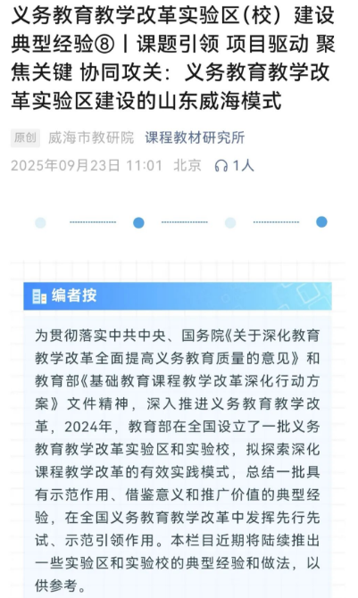 | 教育教研 | 威海教改经验走向全国!义务教育教学改革“威海模式”获教育部课程教材研究所推广 | |||||||||