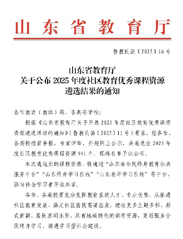 两门课程成功入选省级社区教育优秀课程资源库,是对学校社区教育工作的充分肯定,威海市职业中等专业学校将以此为契机,继续深化社区教育课程建设,开发更多优质课程,满足社区居民多样化学习需求,为推动全民终身学习、构建学习型社会贡献更多力量。 |